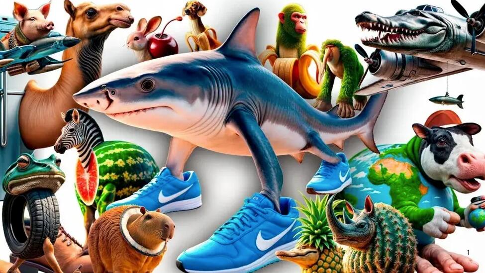 상어와 나이키 운동화, 악어와 폭격기, 통나무와 야구 방망이 등, 논리적으로는 절대 만날 수 없는 요소들이 한 화면에 뒤섞여 있습니다.