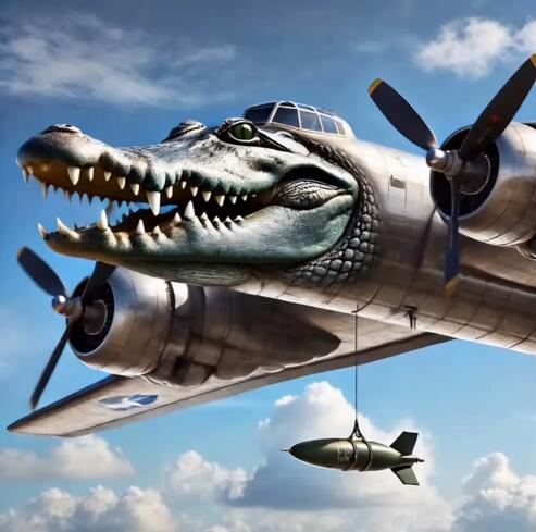 제2차 세계대전 미군 폭격기 B-17의 동체에 악어 머리를 단 괴물, 봄바르디로 크로코딜로(Bombardiro Crocodilo)입니다.