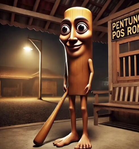 통나무 몸통에 토마스 기관차를 연상시키는 얼굴, 그리고 야구 방망이를 든 모습이 인상적인 캐릭터입니다.