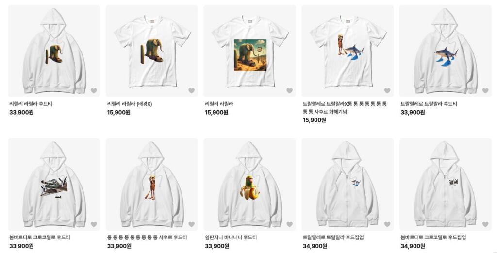 동시에 상업화도 진행돼  마플샵 같은 플랫폼에서는 트랄랄레로 트랄랄라 후드티가 33,900원에 판매되었습니다.